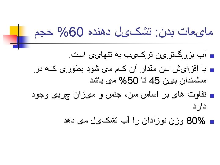 • The proportion of water decreases with aging because fat, age and sex effect of total body water. • (Infant 70 – 80%).