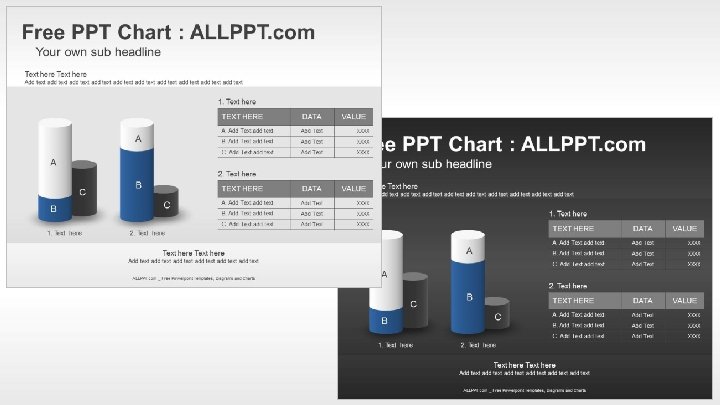 Free PPT Chart : ALLPPT. com Your own sub headline Text here Add text add text add text add text 1. Text here TEXT HERE A A C B 1. Text here A. Add Text add text B. Add Text add text C. Add Text add text DATA Add Text VALUE XXXX 2. Text here B TEXT HERE C A. Add Text add text B. Add Text add text C. Add Text add text 2. Text here Add text add text add text ALLPPT. com _ Free Powerpoint Templates, Diagrams and Charts DATA Add Text VALUE XXXX
