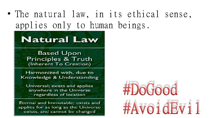 • The natural law, in its ethical sense, applies only to human beings. #Do. Good #Avoid. Evil