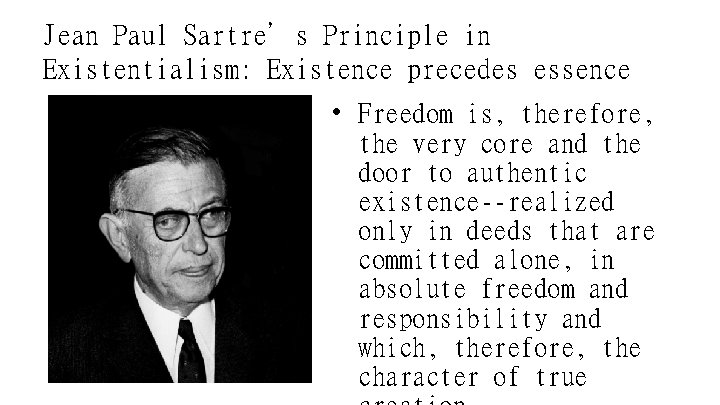 Jean Paul Sartre’s Principle in Existentialism: Existence precedes essence • Freedom is, therefore, the very core and the door to authentic existence--realized only in deeds that are committed alone, in absolute freedom and responsibility and which, therefore, the character of true