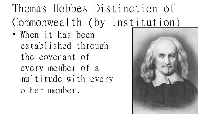 Thomas Hobbes Distinction of Commonwealth (by institution) • When it has been established through the covenant of every member of a multitude with every other member.