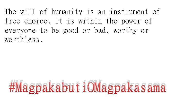 The will of humanity is an instrument of free choice. It is within the power of everyone to be good or bad, worthy or worthless. #Magpakabuti. OMagpakasama