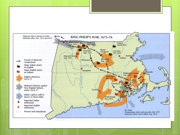 King Philip’s (Metacom) War 1675 -1678 1675, the chief of the Pokanokets, Metacomet (whom the English called King Philip), forged a military alliance including about two-thirds of the region's Indians. In 1675, he led an attack on Swansea, Massachusetts Results: Five percent of New England's population was killed Twelve out of ninety New England towns were destroyed. 40 percent of New England's Native population was killed or fled the region