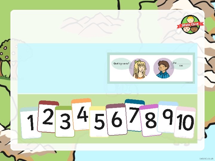 Everyone is given a number card. Together, everyone asks “Quel âge as tu? ”. Wait for the answer and check whether you have the same number on your card. If you have the same answer, stand up, hold up your card and repeat the answer sentence. Quel âge as tu? J’ai ___ans.