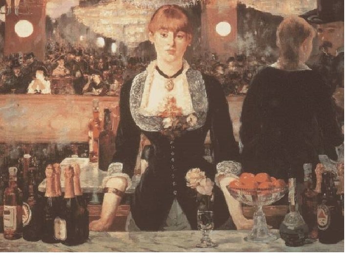 French Impressionism • Le Bar aux Folies-Bergère 1881 -82; Courtauld Institute Galleries, London This sparkling portrayal shows extensive use of peinture claire, (the technique of lighting faces or figures from the front, almost eliminating shadows) a technique Manet himself evolved.