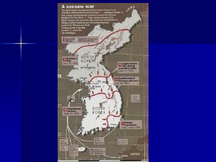 The Korean War - Events l l l l l 1. ) Invasion by the North, June 1950 2. ) UN sanction – Pusan Perimeter August 1950 3. ) Inchon landing – September 1950 4. ) Advance North to the Yalu, Oct. 1950 5. ) Chinese Intervention, November 1950 6. ) Stalemate, April 1951, firing of Mac. Arthur 7. ) Inconclusive fighting, peace talks, 1951 -1953 8. ) Election of Eisenhower, Nov. 1952 9. ) Armistice, July 1953