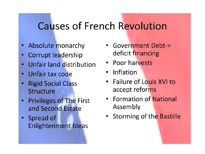 Causes 1. Inequality between classes (3 rd estate had the least and paid the most) The 3 rd Estate starts the Revolution. 2. Debt in France (wars, Marie Antoinette spent a lot of money, etc. )