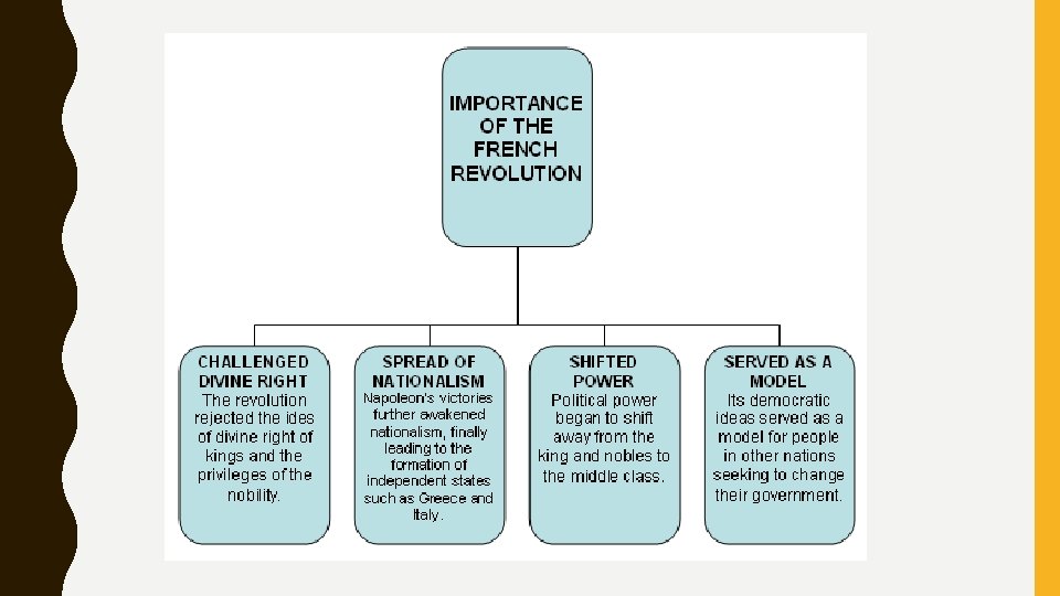 The Significance (importance) of the French Revolution · Challenged Divine Right- The revolution challenged the idea of the divine right of kings and the privileges of the nobility in Europe. · Shifted Power- Political power shift in Europe from the Kings and Nobility to the Middle Class (bourgeoisie) Removed the ridged social classes from France, clearing the way for the creation of a modern capitalist economy. · Spread of Nationalism- Napoleon's victories further awakened nationalism. · Served as a Model- Both the American and French Revolutions served as models for citizens in other countries (Latin America) seeking political change.