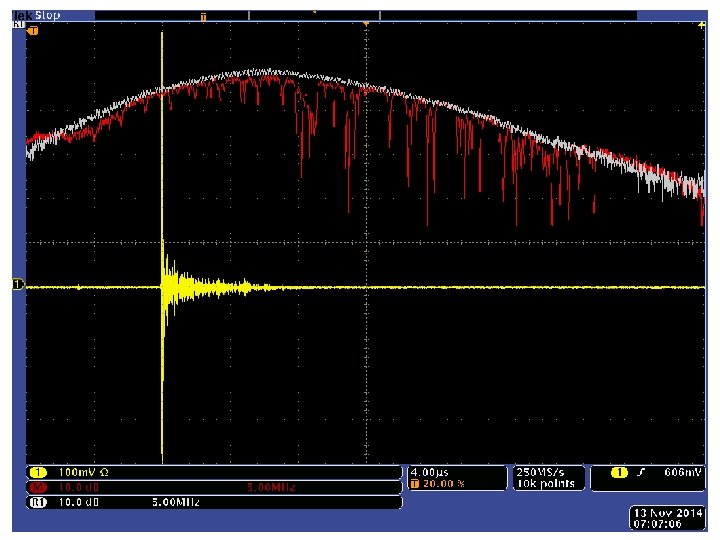 Single Interferogram (Yellow) and FFT spectra (Red) of Reference and absorption spectra in the interest spectral region.