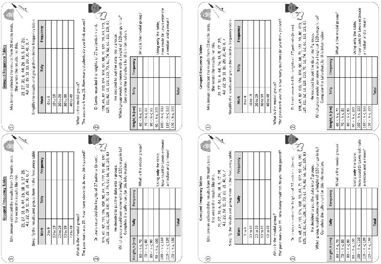 Grouped Frequency Tables ① Grouped Frequency Tables Mrs Jenson collected the results from 20 maths tests. She wrote the results like this. 21, 27, 31, 6, 44, 26, 18, 5, 17, 25, 43, 22, 19, 11, 10, 20, 31, 41, 0, 7 Simplify the results and group them in the frequency table. Mark Tally Frequency Mark Tally 0 to 9 10 to 19 20 to 29 30 to 39 40 to 49 What is the modal group? The pass mark was 25. How many students do you think passed? ② ① Dr Lewis recorded the heights of 27 patients (in cm). Frequency What is the modal group? The pass mark was 25. How many students do you think passed? ② Dr Lewis recorded the heights of 27 patients (in cm). 128, 65, 82, 110, 126, 108, 90, 88, 71, 122, 99, 80, 120, 125, 111, 82, 61, 128, 130, 70, 61, 74, 82, 66, 121, 115, 83 He decided to put the data into 7 groups. Which group would someone with a height of 120 cm go in to? Complete the tally chart for this information. Height, h (cm) Tally Frequency What is the modal group? Using only the table, how could Dr Lewis estimate a median and a mean?