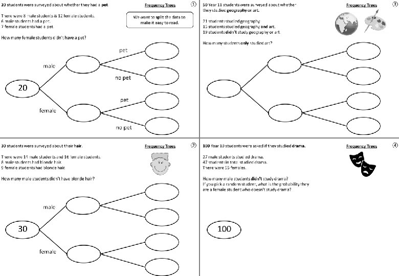 20 students were surveyed about whether they had a pet. Frequency Trees There were 8 male students & 12 female students. 6 male students had a pet. 7 female students had a pet. We want to split the data to make it easy to read. How many female students didn’t have a pet? male pet 6 no pet 2 pet 7 no pet 5 8 20 female 12 ①