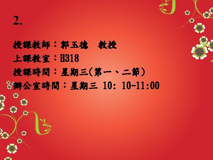 5. Grading: The Ratios of Grade distribution go as follows: in-class quizzes (30%) attendance & class performance (20%), midterm exam (25%), final exam (25%). One point from the final grade will be deducted for each hour of absence.