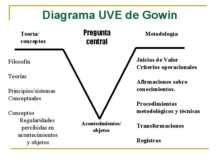 Diagrama UVE de Gowin Teoría/ conceptos Pregunta central Juicios de Valor Criterios operacionales Filosofía Teorías Afirmaciones sobre conocimientos. Principios/sistemas Conceptuales Conceptos Regularidades percibidas en acontecimientos y objetos Metodología Procedimientos metodológicos y técnicas Acontecimientos/ objetos Transformaciones Registros