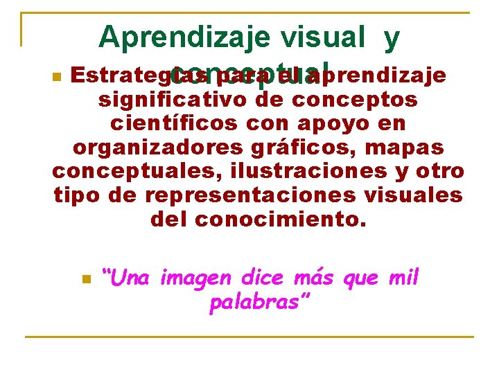 Aprendizaje visual y n Estrategias para el aprendizaje conceptual significativo de conceptos científicos con apoyo en organizadores gráficos, mapas conceptuales, ilustraciones y otro tipo de representaciones visuales del conocimiento. n “Una imagen dice más que mil palabras”