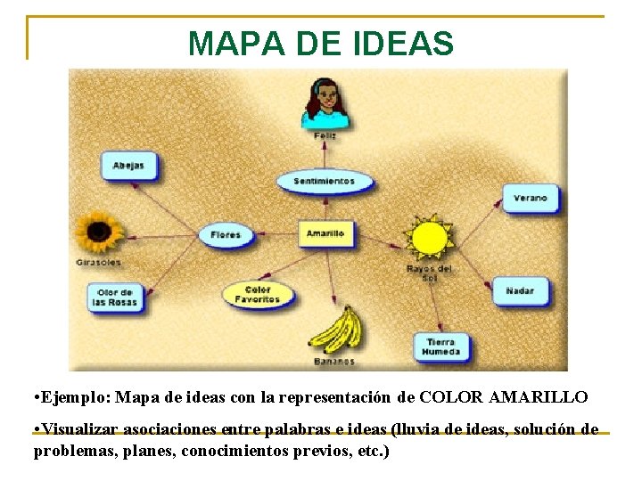 MAPA DE IDEAS • Ejemplo: Mapa de ideas con la representación de COLOR AMARILLO • Visualizar asociaciones entre palabras e ideas (lluvia de ideas, solución de problemas, planes, conocimientos previos, etc. )