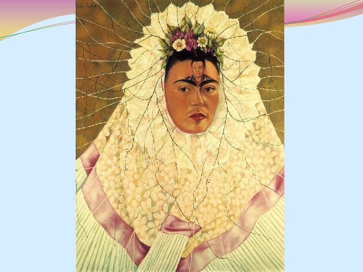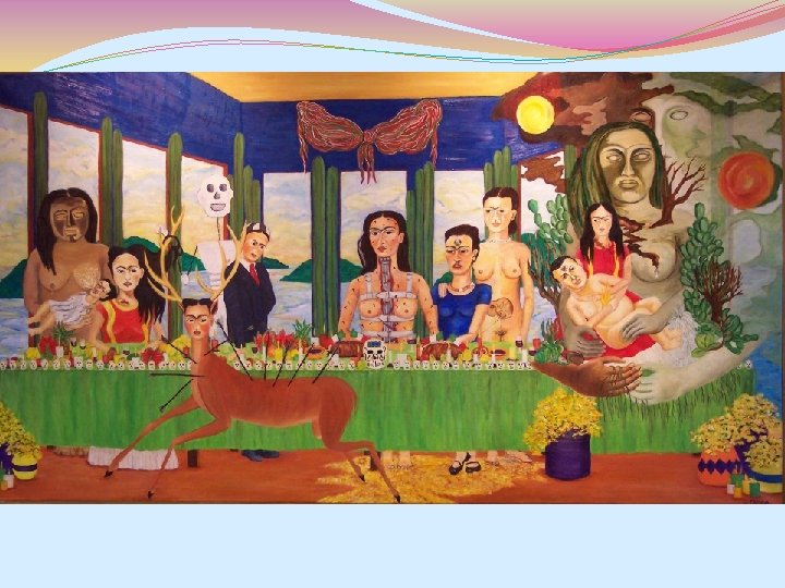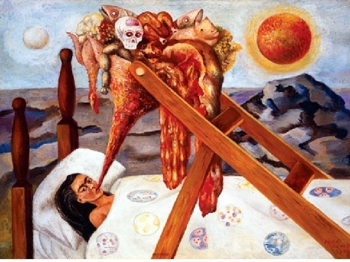 Obras de Frida Kahlo �Las pinturas de Kahlo son autor rectores y basadas en naturaleza muertas �Sus pinturas están llenas de colores y son formas del arte folklórico mexicano. �La mayoría de sus obras son basadas en surrealismo( imaginación, y sueños)