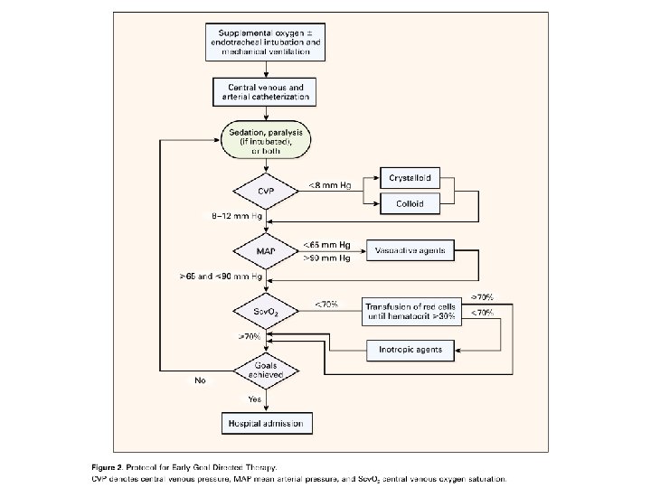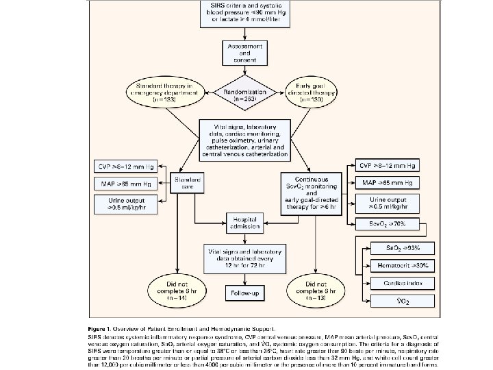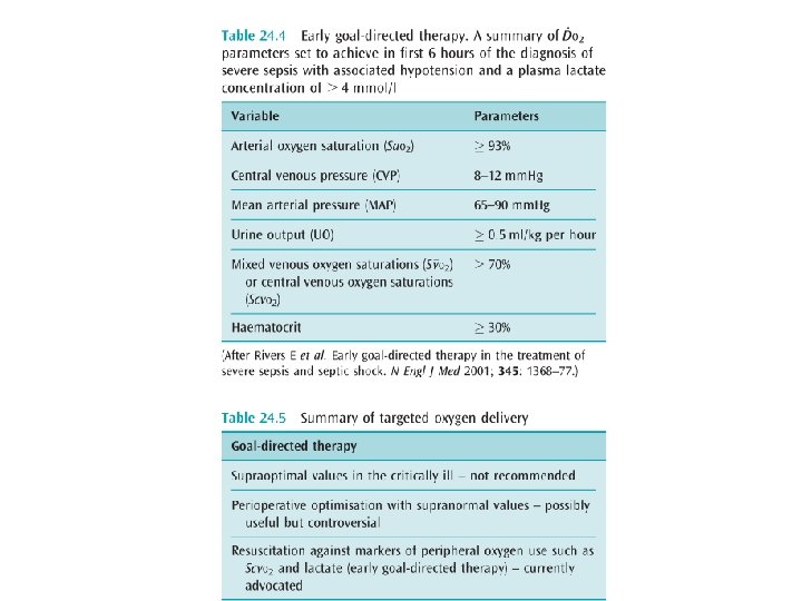 Relationship between supply and demand of O 2 • Tissue hypoxia = inadequate delivery or defective extraction of O 2 (latter more difficult to correct) • Resuscitation beyond supra-normal oxygen requirement not helpful • Early goal directed therapy now included in guidelines for treatment of severe sepsis
