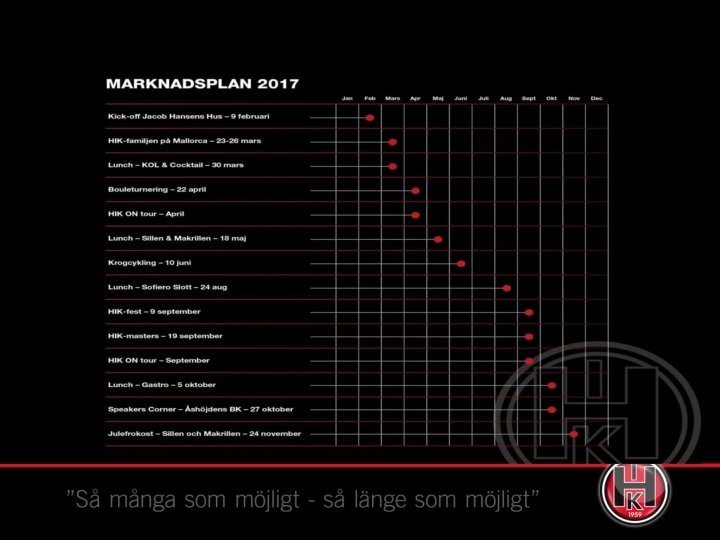Årskalender 2017 v v v v 8/4 15/4 14/5 25/5 17/6 19 -22/6 4 -6/8 12/8 19/8 Vecka 34 25 -27/8 9/9 21/10 9/12 Inskrivning Fotboll – F/P: 12 Premiär Lördagsfotboll & seriespel FS Gymnastikuppvisning Friends Cup Sommaravslutning fotboll Fotbollsskola F/P: 04 -09 Eskilscupen Höststart Fotboll Inskrivning Gymnastik Höststart Gymnastik Parkering, Sofiero HIK-dag/fest Fotbollsavslutning/Gåsaboll Julmarknad på Laröds IP