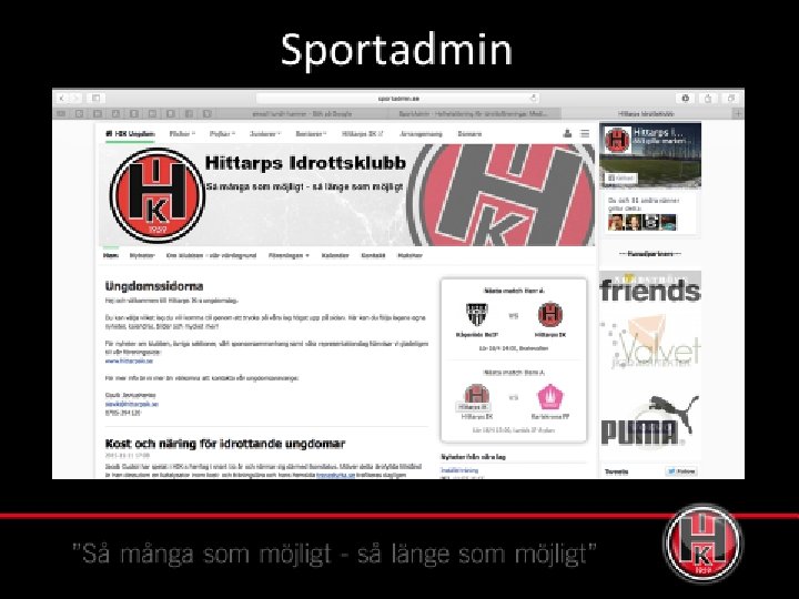Mattias Hallberg Sportchef/varumärke/kommunikation v Övergripande ansvar Fotbollsresan (implementering, uppföljning) v Ladda varumärket Hittarps IK v Fotbolls S v Friends (implementering, uppföljning) v Stiftelser och bidrag v Kommunikation (Hemsida, sociala medier, Hänt i HIK) Kontakt: 0705 -394215 Mattias. hallberg@hittarpsik. se , uppföljning) - Kommunikation (hemsida, FB, )