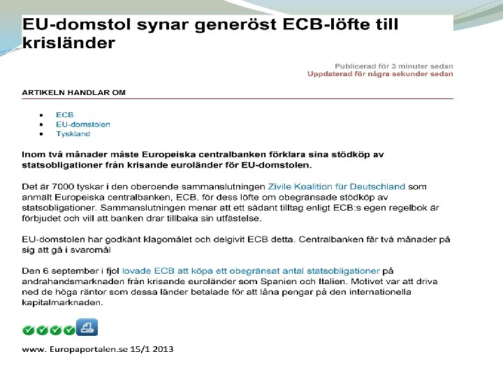 Nyligen Förslag på eurobligationer. Övergivit till förmån för en bankunion inom eurozonen. ECB ska övervaka bankerna. Protester mot EUs nuvarande inriktning. För mycket centralisering. Subsidiaritetsprincipen glömd ? Demokratiskt underskott Oenighet om kommande EU-budget Bail-in av cypriotiska banker. Alla med belopp över 100 k. EUR fick se delar av det överskridande beloppet ”konfiskerat”. di. se – Nyheter Regeringen ökar pressen på svenska EU-parlamentariker | Europaportalen