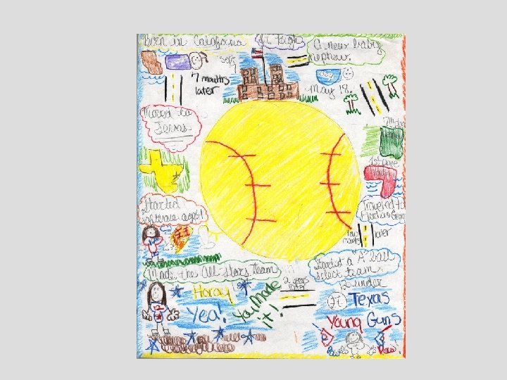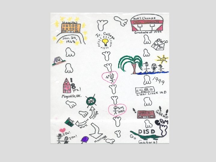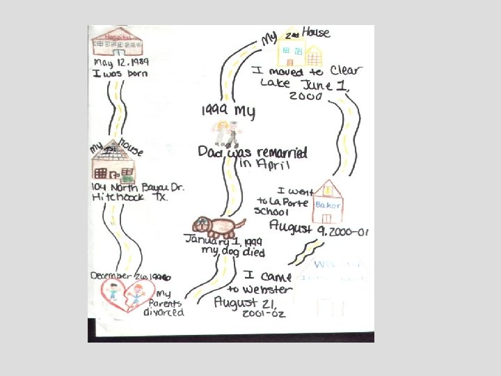 Make the Lesson Plan your own! For seventh graders: • Make a map of your life from birth to present. Illustrate the hills, valleys, thrills, and conflicts. Be specific. Be colorful. • Where were you born? • Where have you lived? • Where was your first learning experience? • You must have at least ten colorful events.