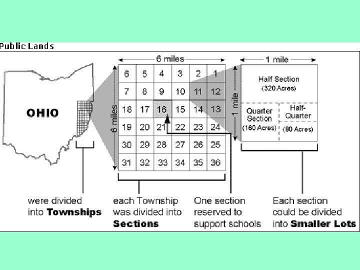 Land Ordinance of 1785 • Arthur St. Clair, president number seven, issued the Northwest Ordinance that annexed the Northwest Territory for future settlements. • Surveyors staked out six-mile-square plots, called townships, in the Western lands • The townships were broke down into 36 squares • A township was 640 acres • The sixteenth square was designated for public education