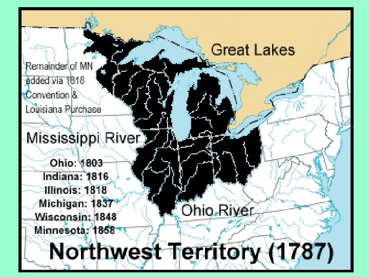 Northwest Ordinance • Described how the Northwest Territory was to be governed • When there were 5, 000 free males in an area , that owned at least 50 acres of land a piece they could elect an assembly • They could apply to become a state when they reached 60, 000 people • It also outlined the laws of the Northwest Territory and set the pattern for growth in the United States