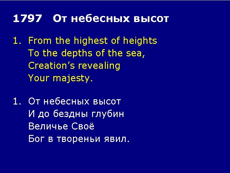 From the colours of fall To the fragrance of spring, Ev’ry creature unique In the song that it sings. All exclaiming: От осенних листов До цветенья весны, Всё творенье поёт, Славят Бога они. Будем славить!