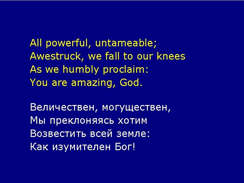 Chorus 2 Indescribable, uncontainable, You placed the stars in the sky, And You know them by name: You are amazing, God. Припев 2 -ой Удивительный, восхитительный, Он вывел звёзды на небо, Им дал имена. Ты изумительный Бог!