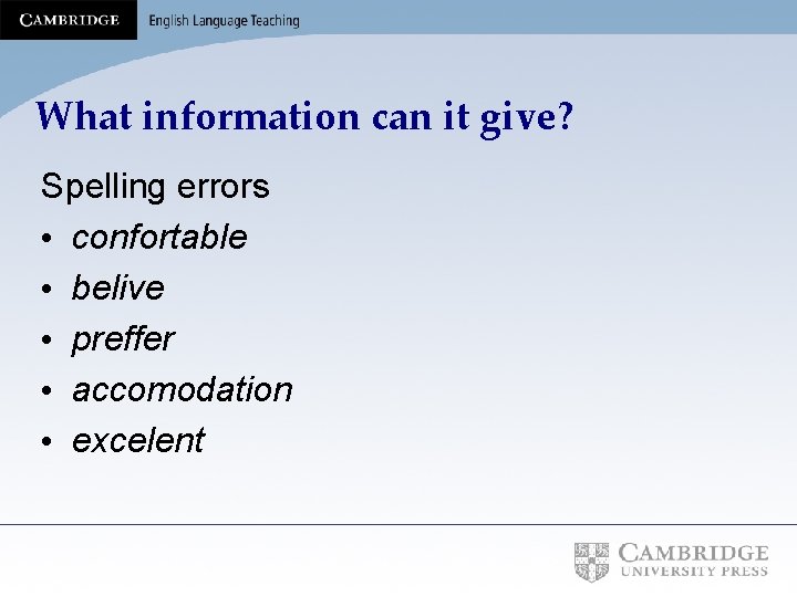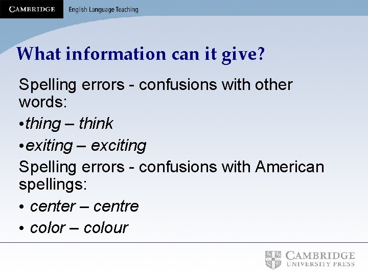 What information can it give? Spelling errors - confusions with other words: • thing – think • exiting – exciting Spelling errors - confusions with American spellings: • center – centre • color – colour