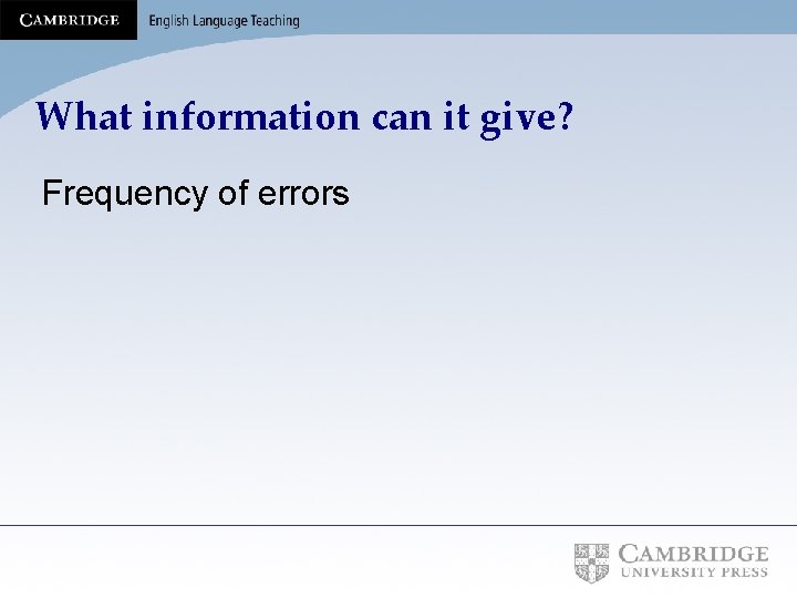 In this workshop we will look at • what the Cambridge Learner Corpus (CLC) is • what information it can give • how it can be used in the classroom • how it can be used in course design • how it can be used to encourage learner autonomy.