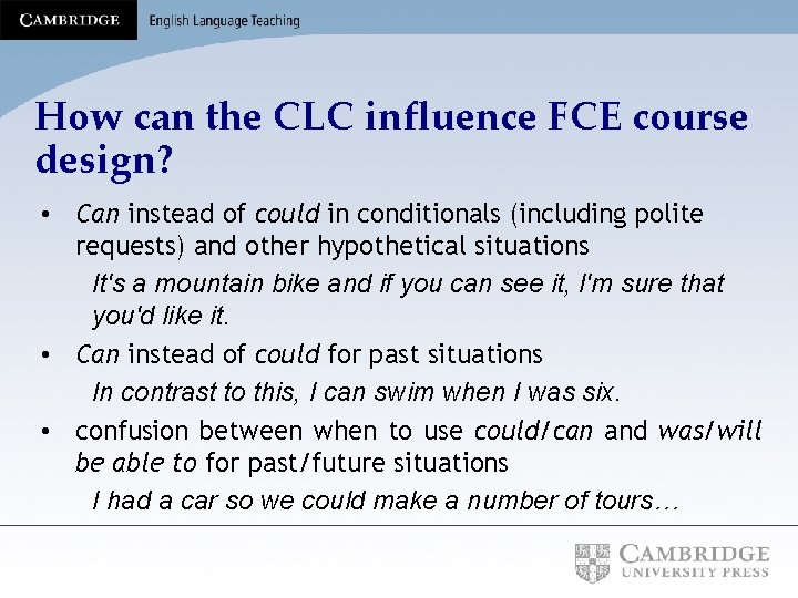 How can the CLC influence FCE course design? • Can instead of could in conditionals (including polite requests) and other hypothetical situations It's a mountain bike and if you can see it, I'm sure that you'd like it. • Can instead of could for past situations In contrast to this, I can swim when I was six. • confusion between when to use could/can and was/will be able to for past/future situations I had a car so we could make a number of tours…