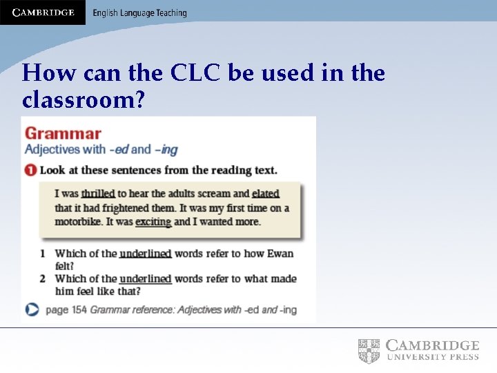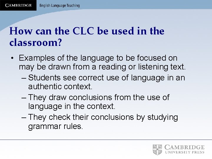 How can the CLC be used in the classroom? • Examples of the language to be focused on may be drawn from a reading or listening text. – Students see correct use of language in an authentic context. – They draw conclusions from the use of language in the context. – They check their conclusions by studying grammar rules.