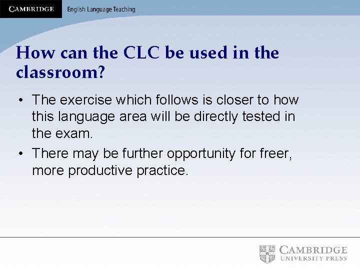 How can the CLC be used in the classroom? • The exercise which follows is closer to how this language area will be directly tested in the exam. • There may be further opportunity for freer, more productive practice.
