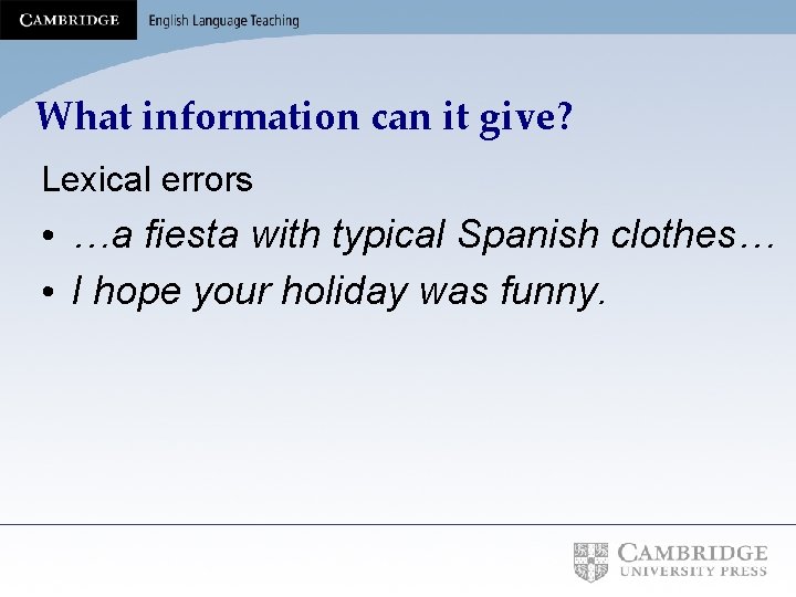 What information can it give? Lexical errors • …a fiesta with typical Spanish clothes… • I hope your holiday was funny.