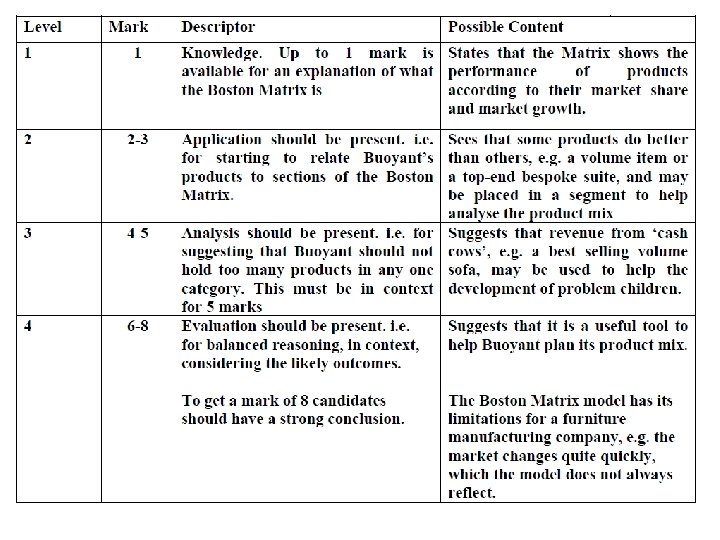 Boston Matrix Explained Star: • A product in this quarter will have high market share and high market growth • This product may be in the growth phase of the product life cycle • Production of this product should remain consistent while profits are harvested Question mark: • Also known in some books as a problem child • A product in this quarter enjoys high market growth but low market share • This product may have just been launched on the market and is building its customer loyalty • Products should be invested in while their market share builds Cash cow: • Products in this quarter are reaching the maturity of their product life cycle but still have customer loyalty • Products should be produced until sales start to decline Dog: • Products in this quarter face declining sales in declining markets • Products may be in the decline phase of their product life cycle • For example video tapes or top hats • These products should be removed from sale