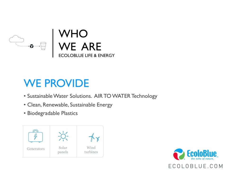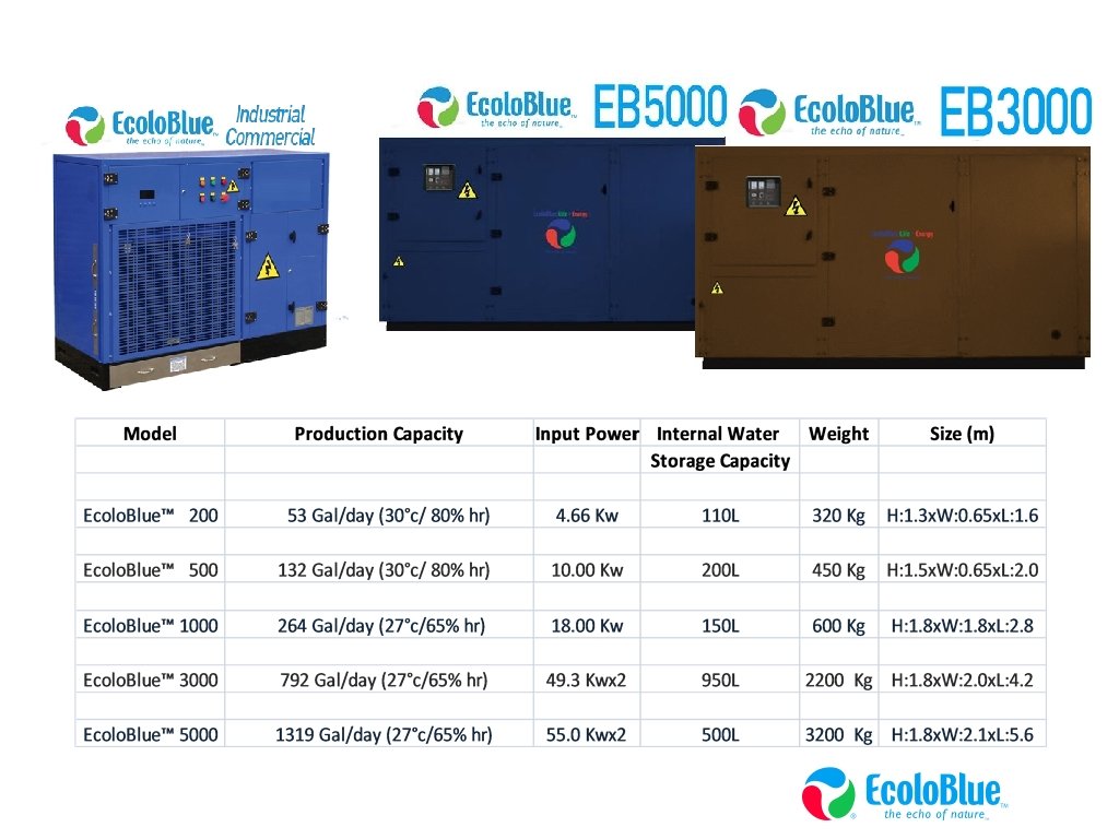 HOME & OFFICE ATMOSPHERIC WATER GENERATORS ECOLOBLUE 30 Deluxe Solar Bundle Ecolo. Blue 30 Atmospheric Water Generator plus: 2000 Watt Peak Solar Kit • Panels • Controller • Inverter • Cabinet • Cables • Batteries