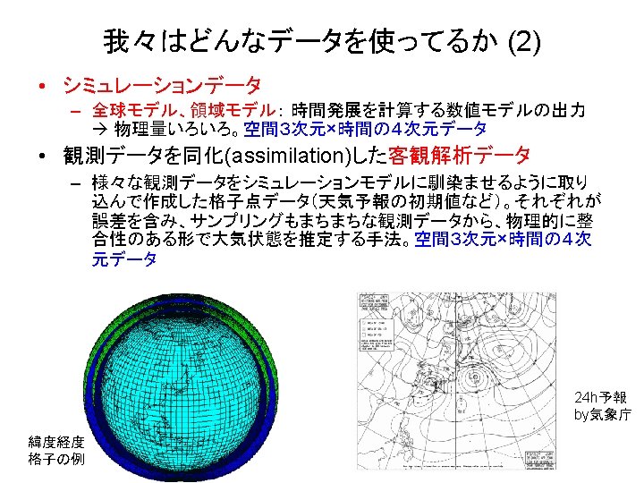 NCEP再解析(客観解 析)の気温データを収め るNet. CDFファイルの「 ヘッダ」(メタデータ)の 内容。 ダンプツール ncdump で表示後、一部省略。 airが気温の4次元デー タ: lon, lat, level, time の関数。 バイナリ構造は隠蔽さ れ、名前ベースでアクセ ス。 $ ncdump -h air. 2007. nc netcdf air. 2007 { dimensions: lon = 144 ; lat = 73 ; level = 17 ; time = UNLIMITED ; // (365 currently) variables: float level(level) ; level: units = "millibar" ; level: long_name = "Level" ; float lat(lat) ; lat: units = "degrees_north" ; lat: long_name = "Latitude" ; float lon(lon) ; lon: units = "degrees_east" ; lon: long_name = "Longitude" ; double time(time) ; time: units = "hours since 1 -1 -1 00: 0. 0" ; time: long_name = "Time" ; short air(time, level, lat, lon) ; air: long_name = "mean Daily Air temperature" ; air: valid_range = 150. f, 350. f ; air: units = "deg. K" ; air: add_offset = 477. 66 f ; air: scale_factor = 0. 01 f ; air: missing_value = 32766 s ; air: precision = 2 s ; // global attributes: : Conventions = "COARDS" ; : title = "mean daily NMC reanalysis (2007)" ; : history = "created 2007/01/03 by Hoop (net. CDF 2. 3)" ; : description = "Data is from NMC initialized reanalysisn", "(4 x/day). It consists of most variables interpolated ton "pressure surfaces from model (sigma) surfaces. " ;