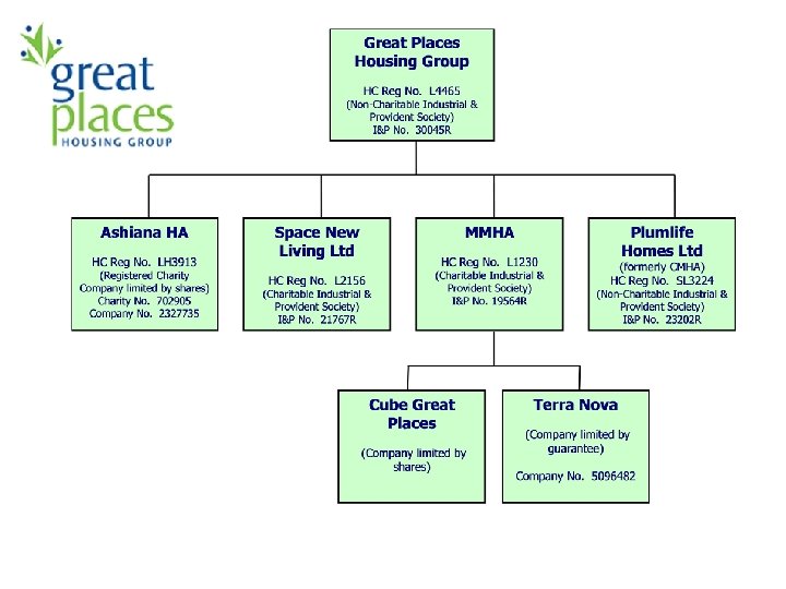 Governance review (proposals): • ‘Professionalised’ Group Board • 14 Non-Exec + 1 Non-Exec (C/Ex) • Paid board members • Formal terms & conditions, appraisal etc Great Places Housing Group Board Tenant Assembly Plumlife Homes Ltd