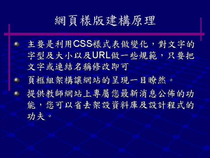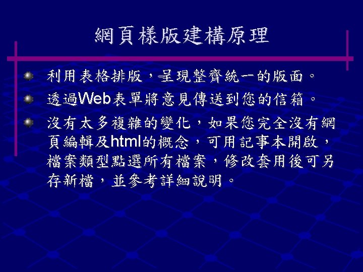Front Page UNIX Home Page 581 en 021 Slides: 21 Download presentation 建立個人 Front. Page 的方法 凡本校師生有 UNIX 作站帳號者,均可自行建立 自己的 Home Page 以帳號 581 en 021 為例 : 1. 在 sun 2. cc. ntut. edu. tw 或 sun. cc. ntut. edu. tw 之 home directory 下建立一個子目錄並命名為 public_html (即 ~581 en 021/public_html), 2. 即可在 public_html 子目錄下建自己的 Home Page 。 3. 指令說明:在 UNIX 系統中建一個子目錄可用 mkdir , 即 mkdir public_html 4. 此 Home Page 之 URL Location 為 http: //www. cc. ntut. edu. tw/~581 en 021 。 5. 建立Front. Page的方法,可參閱HTML烘培雞(這裡) YAHOO 網頁設計資訊 就是跑到這裡啦! n http: //tw. search. yahoo. com/search? ei=UTF-8&p=html