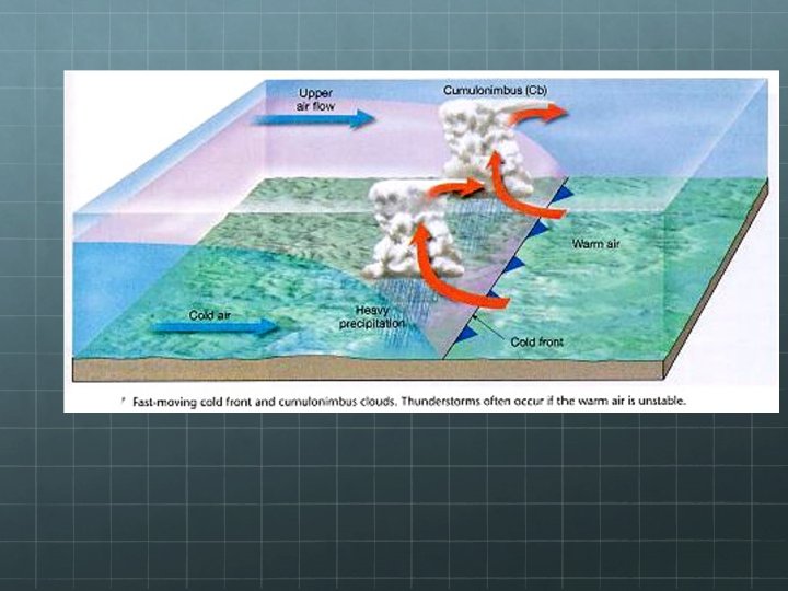 Weather Conditions: Cold fronts move quickly, therefore they can cause abrupt weather changes. Strong winds and severe thunderstorms often occur. If enough water is in the air, heavy rain or snow can occur. If little water in the air, then there are only cloudy skies.