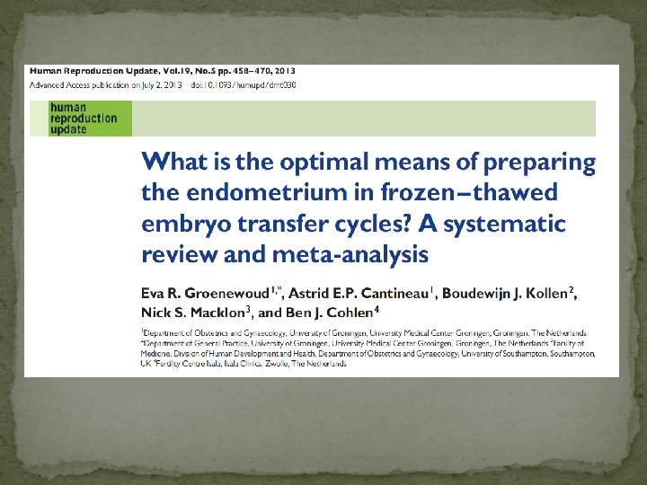 N-FET protokolü + h. CG ? ? ? 5 çalışma, LBR fark yok � Idrar veya kan LH monitörizasyon %30 YANLIŞ POZİTİF �Vizit sıklığını azaltmaktadır. (Weissman et al RBM 2011) � h. CG sekretuar endometrium gelişimine katkıda bulunabilir ? ? . (Ben-Meir A et al. Fertil. Steril 2010)