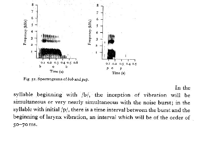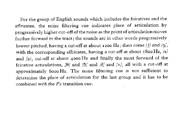 Fry: acoustic cues for consonants p 137 • plosives: • fricatives: • nasals: The cue for fricatives • laterals and semi-vowels: