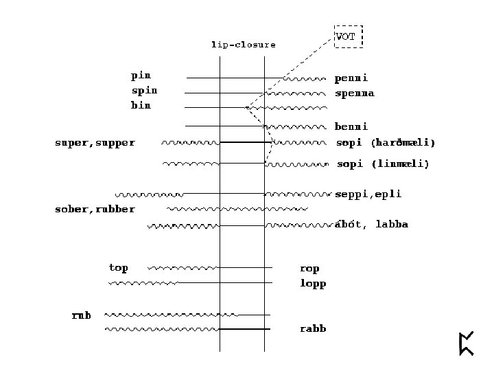 VOT lip closure no voicing release labour, grabber ábót, labba super, supper penni spenna, benni pin spin bin rabb, rop rub topp
