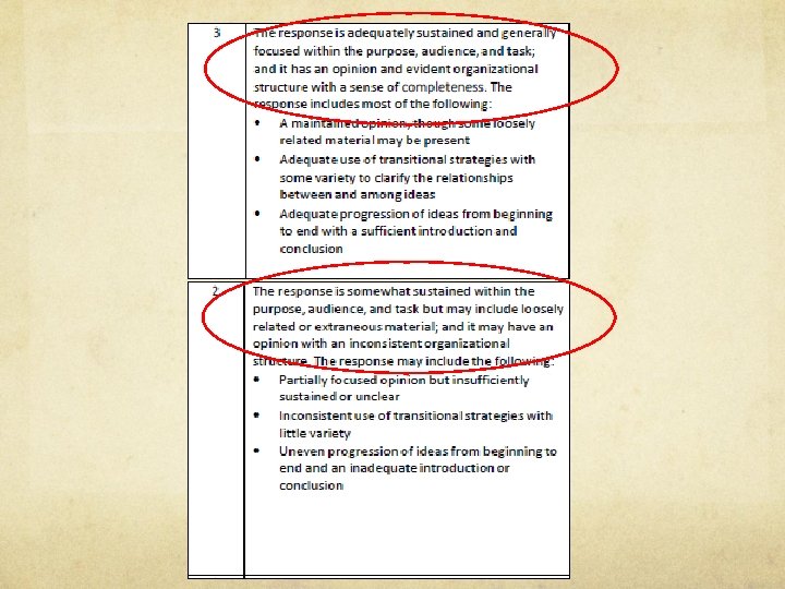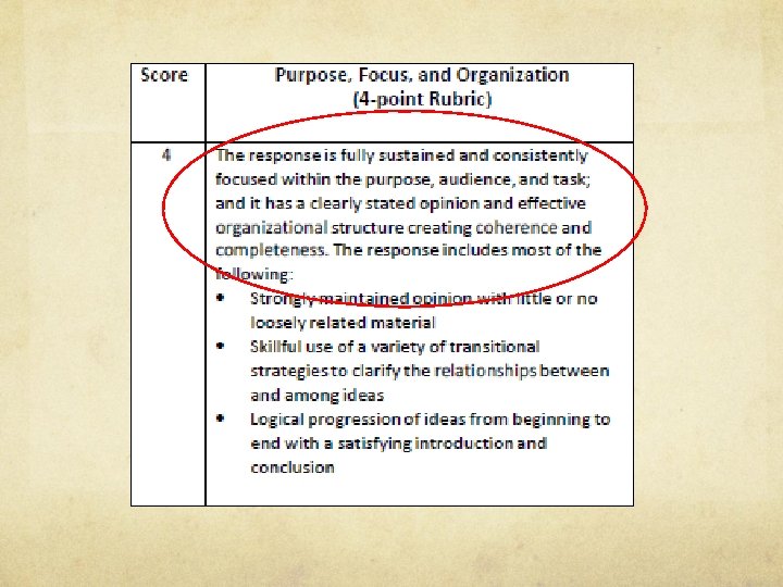 Step 2: Confirm with Rubric Bullets (Repeat for each section of the rubric. ) Does the writing meet MOST of the descriptors? Which level most accurately describes the writing?