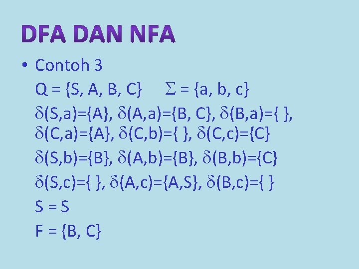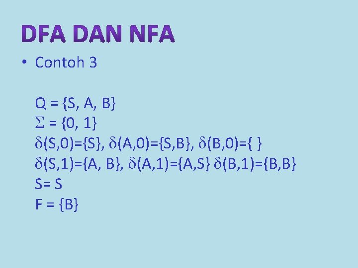 2. Dalam Tabel Transisi state Tujuan ditulis dalam bentuk himpunan S A B a {A} {A, B} {A} b {S} {} {B, B} dalam bentuk himpunan