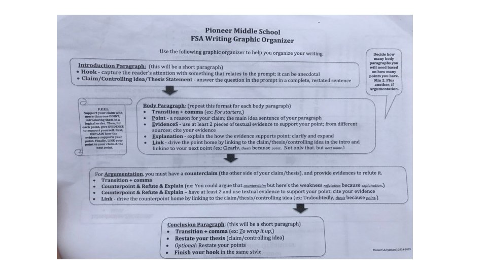 Body Paragraphs • Topic sentence: Start with a clear sentence that tells the reader what to expect from the rest of the paragraphs. • It might be helpful to organize your body paragraphs like this: • 1. ) Claim Point #1 Using P. E. E. L • 2. ) Claim Point #2 Using P. E. E. L • Address counterclaim by telling the reader why those claims are incorrect and why your claim is better.