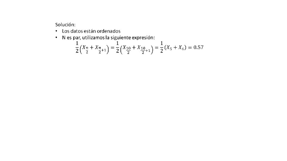 Ejemplo 2 Una toma de datos de un experimenta arroja los siguientes resultados 0. 48 0. 50 0. 52 0. 55 0. 56 0. 58 0. 60 0. 63 0. 66 0. 69 Calcular la mediana