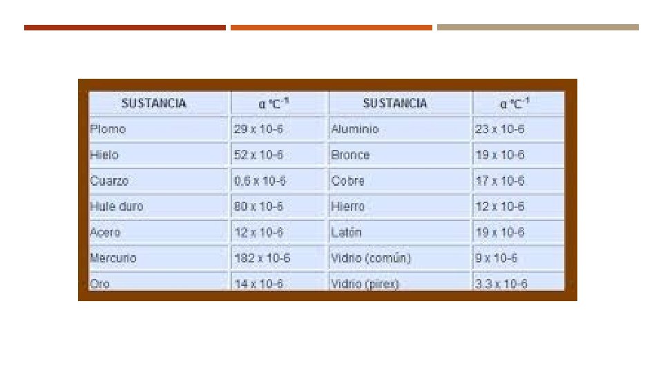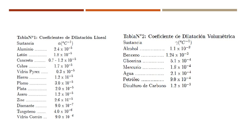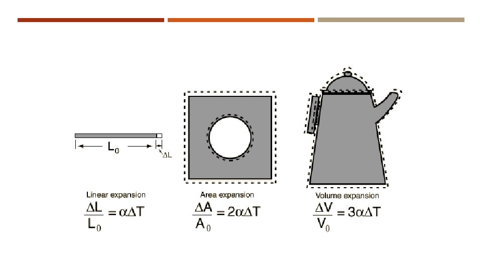 TIPOS DE DILATACIÓN LINEAL Se produce en alambres, varillas, barras, rieles, etc. DILATACIÓN SUPERFICIAL (ÁREA) Se produce en baldosas, vidrio, placas metálicas, etc. DILATATACIÓN VOLUMÉTRICA Se produce en gases, líquidos y cuerpos geométricos.