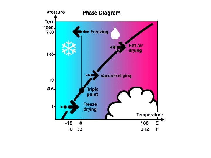 Freeze drying • 1) freeze food in the conventional freezing equipment • 2) remove water during subsequent drying • (If the water vapor pressure of a food is below 4. 58 Torr (610. 05 Pa) and the water is frozen, when the food is heated the solid ice sublimes directly to vapor without melting. • The water vapor is continuously removed from the food by keeping the pressure in the freeze drier cabinet below the vapor pressure at the surface of the ice, removing vapor with a vacuum pump and condensing it on refrigeration coils. • As drying proceeds a sublimation front moves into the frozen food leaving partly dried food behind it.